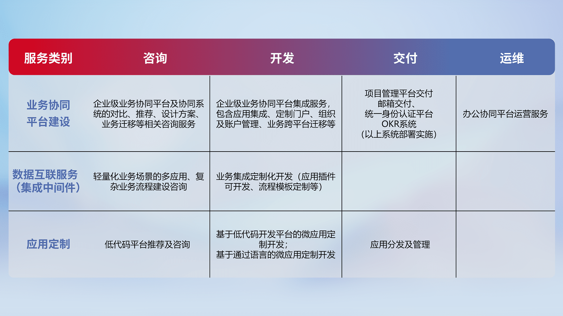 针对钉钉、、、、企微、、IDaas等平台级产品提供产品的规划、、方案、、、、交付、、、、定制化开发等服务,,,,实现如统一协同办公、、、、智能客户服务、、、、混合会议管理、、、智能数据查询、、等业务场景,,,实现数字化转型。。。。